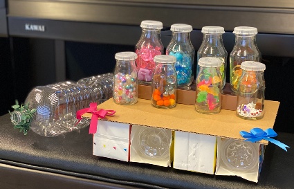 ペットボトルに空気を入れ音が変わる楽器。空気圧を利用して高音→低音と音を変えていきます。(小学生)