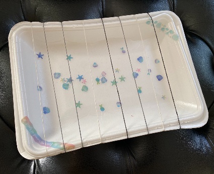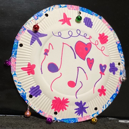 ペットボトルキャップと紙皿を使ったタンブリン。キレイなおりがみがポイント。