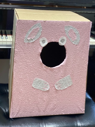 大賞に輝いた作品!ピンクのうさぎのカホンです。ダンボールで作ってあります。(小学生)