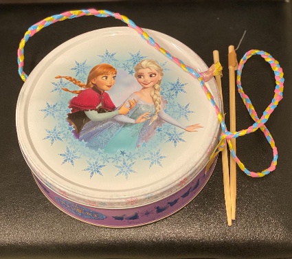 アナ雪の缶で作った太鼓です。カンカンと乾いた音がします。編んである紐もステキです。(幼児さん)