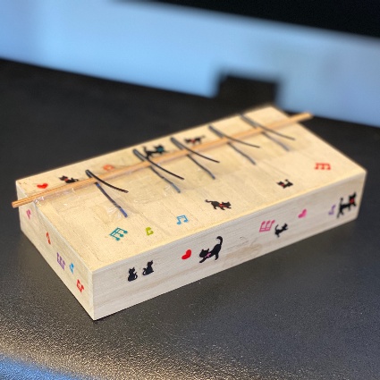 親指ピアノと呼ばれている、カリンバです。ヘアピンと竹ひごで作られています。(中学生)
