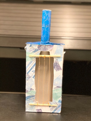 発砲スチロールと輪ゴムで作った楽器。身近にある物ですが、良い音が鳴ります。(小学生)