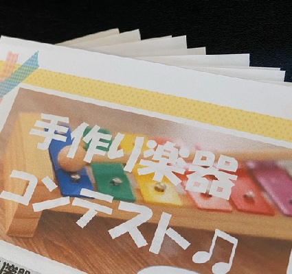 A4のクリアファイルとダンボールで作ってあります。首にひもをかけて演奏します。(小学生)