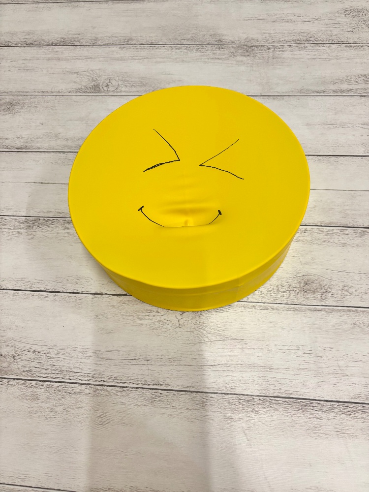 にっこりマークの、ふうせん太鼓。大きな黄色いふうせんを丸い缶にかぶせました。