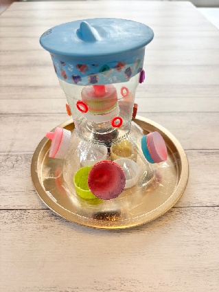 想像力豊かなタワー型の楽器。ペットボトルキャップとふうせんをたくさん使っています。