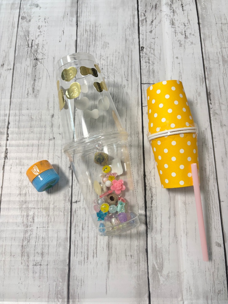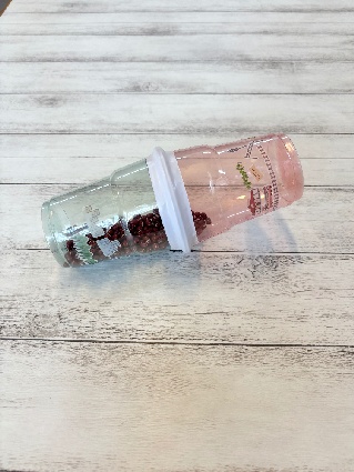 ビーズのシェイカー。細かいビーズの音が心地よく感じます。ポイントはピンク色の底の部分。光に透かすと綺麗です。