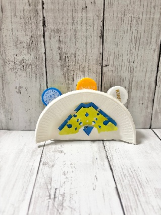 ペットボトルキャップと紙皿を使ったタンブリン。キレイなおりがみがポイント。