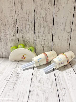 ストローとシャボン玉の吹き棒、画用紙で作ってあるカラフルなラッパです。(小学生)