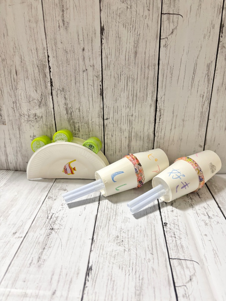 紙皿と紙コップで作ったタンブリンとマラカス。マラカスには、ピアノ大好き♡な文字入り。