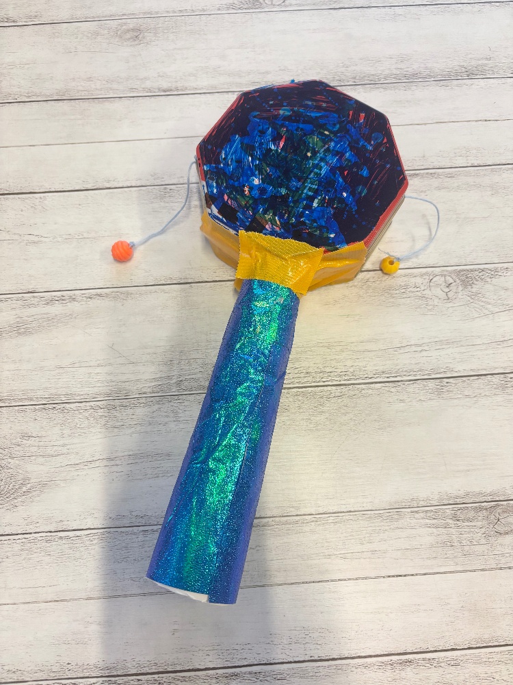元気になるカラフルな色のギロ。ストローの部分を鳴らすとギロに、叩くと太鼓になります。(幼児さん)