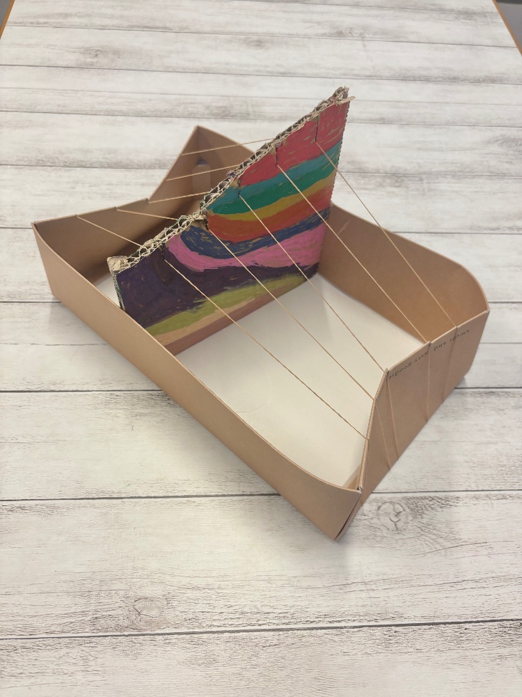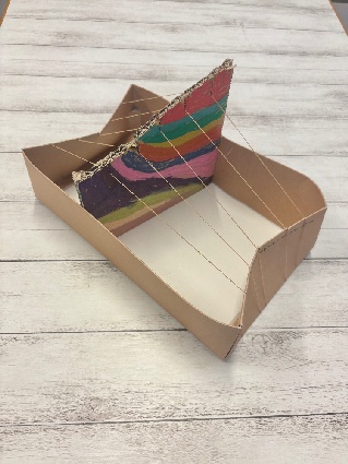 発砲スチロールと輪ゴムで作った楽器。身近にある物ですが、良い音が鳴ります。(小学生)