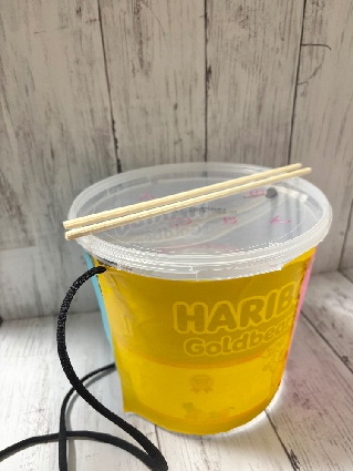 HARIBOのプラスチック容器を使った太鼓。割り箸で叩くと、太くて良い音が鳴ります。