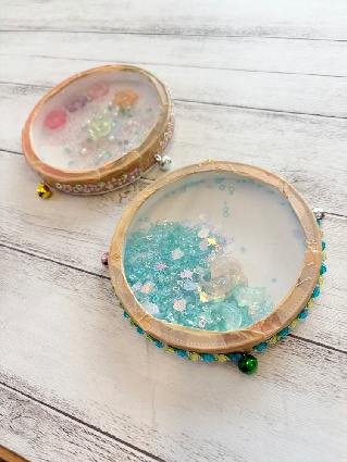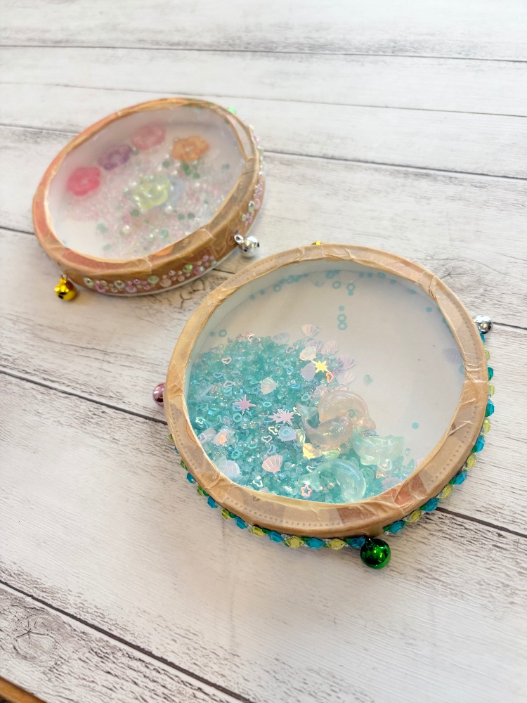 2種類のシードラム。中に入るビーズ等の量で、海の音を再現。叩くとタンブリンにもなる楽器。