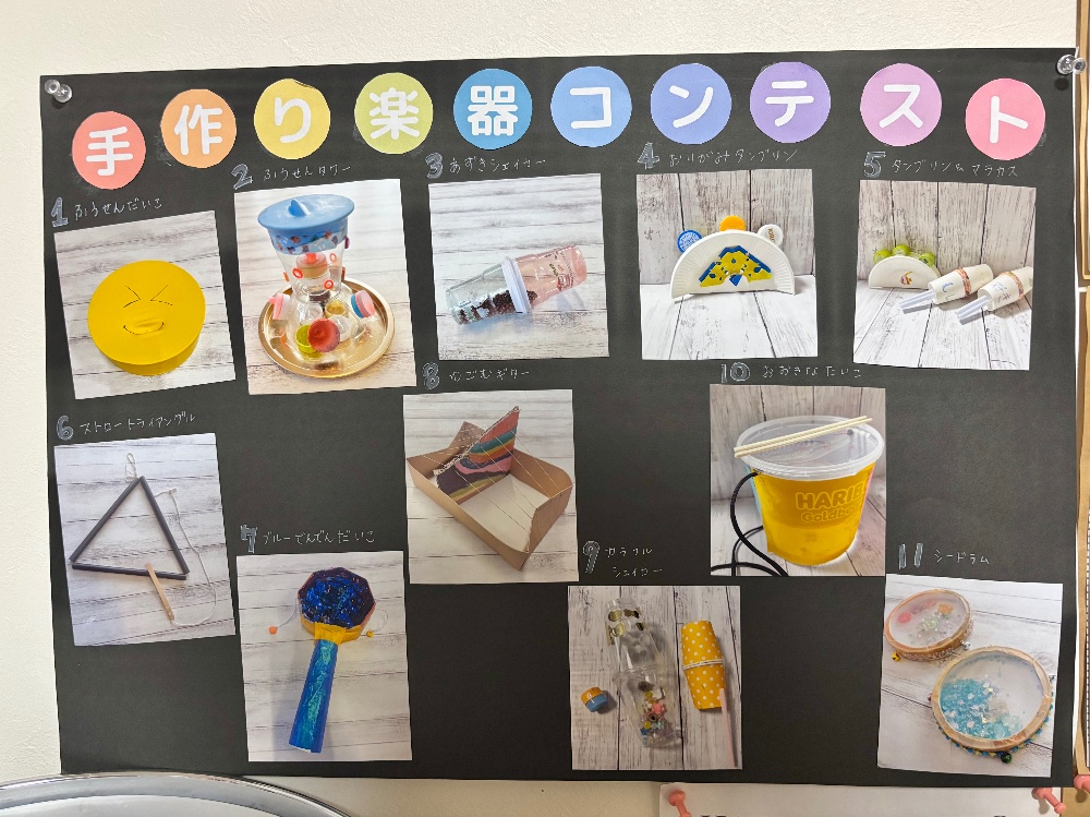 教室には、みんなの作成した楽器の写真が飾ってあります。